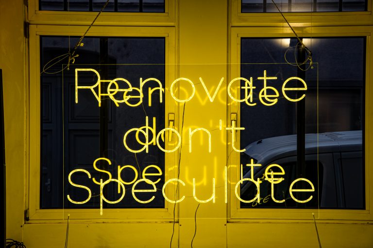 Unter dem Slogan „Renovate don’t speculate“ macht sie deutlich, dass der fortlaufende Abriss sowohl dem Klima schadet, als auch soziale Folgen hat – steigende Mieten und aufgeheizte Städte betreffen uns alle.